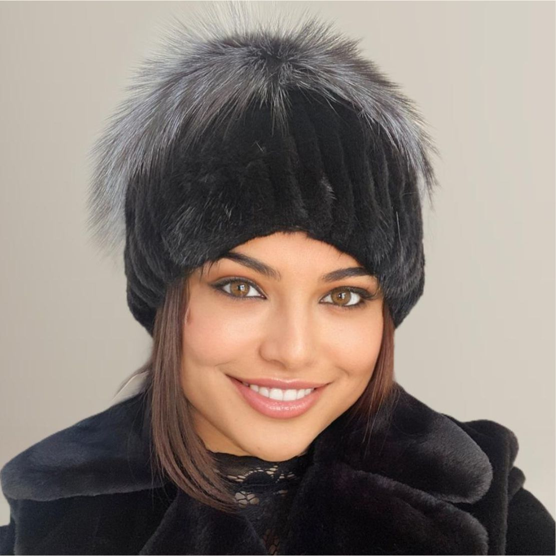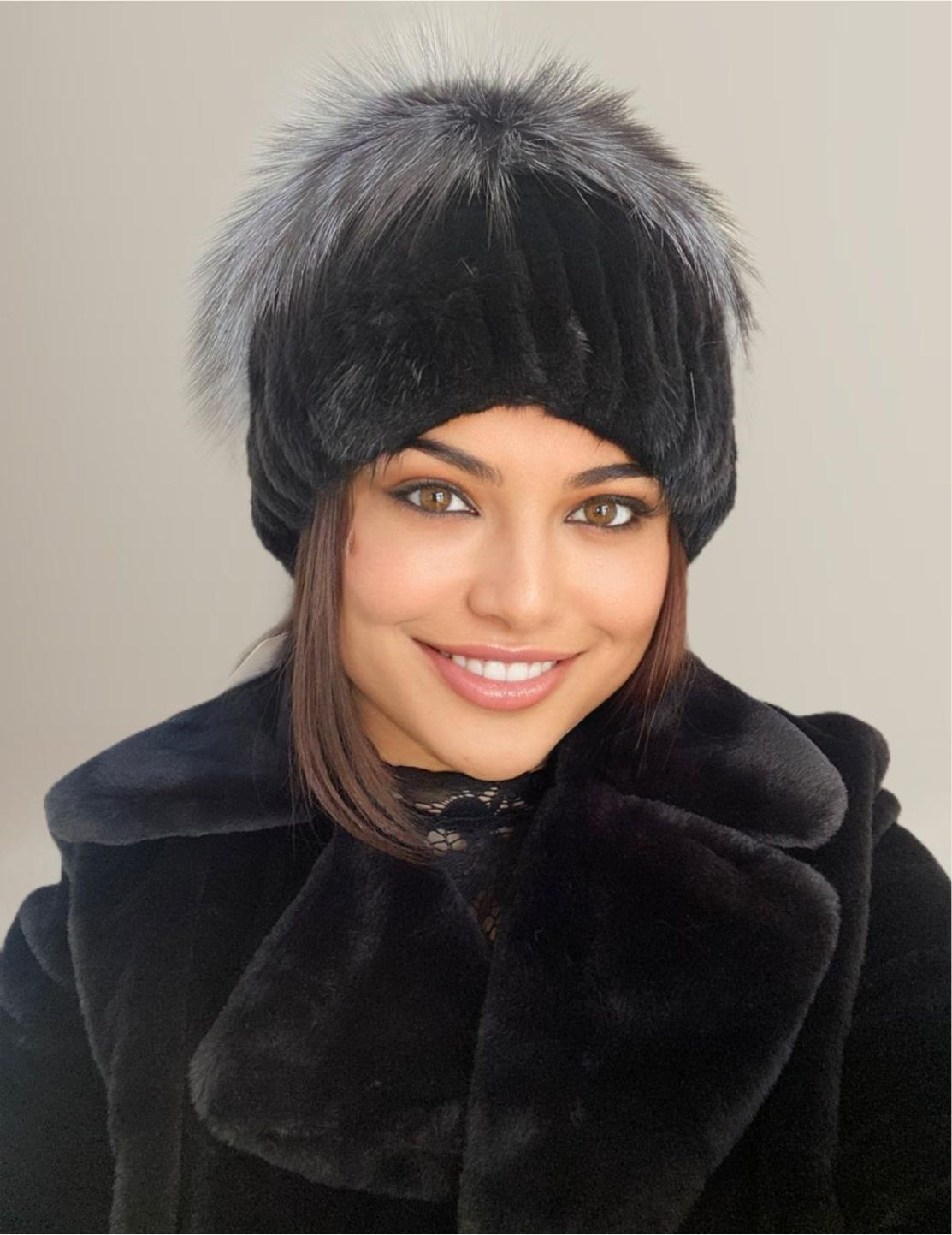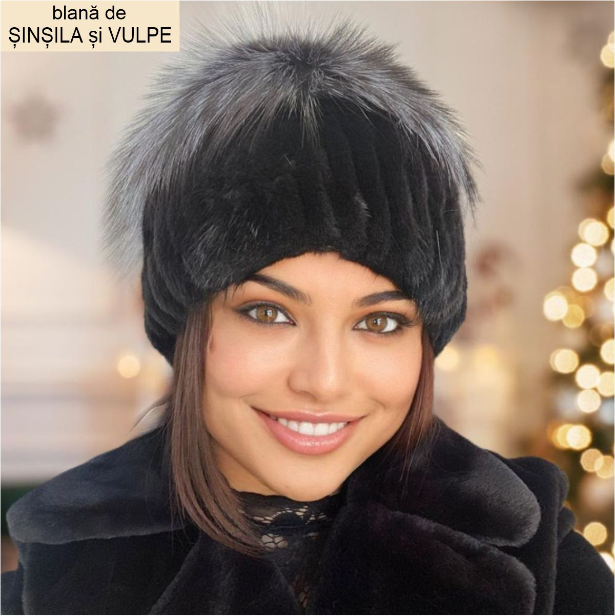 Caciula din blana sinsila + vulpe Lady Lux (NEGRU+GRI/MARO spicat) - marime universala