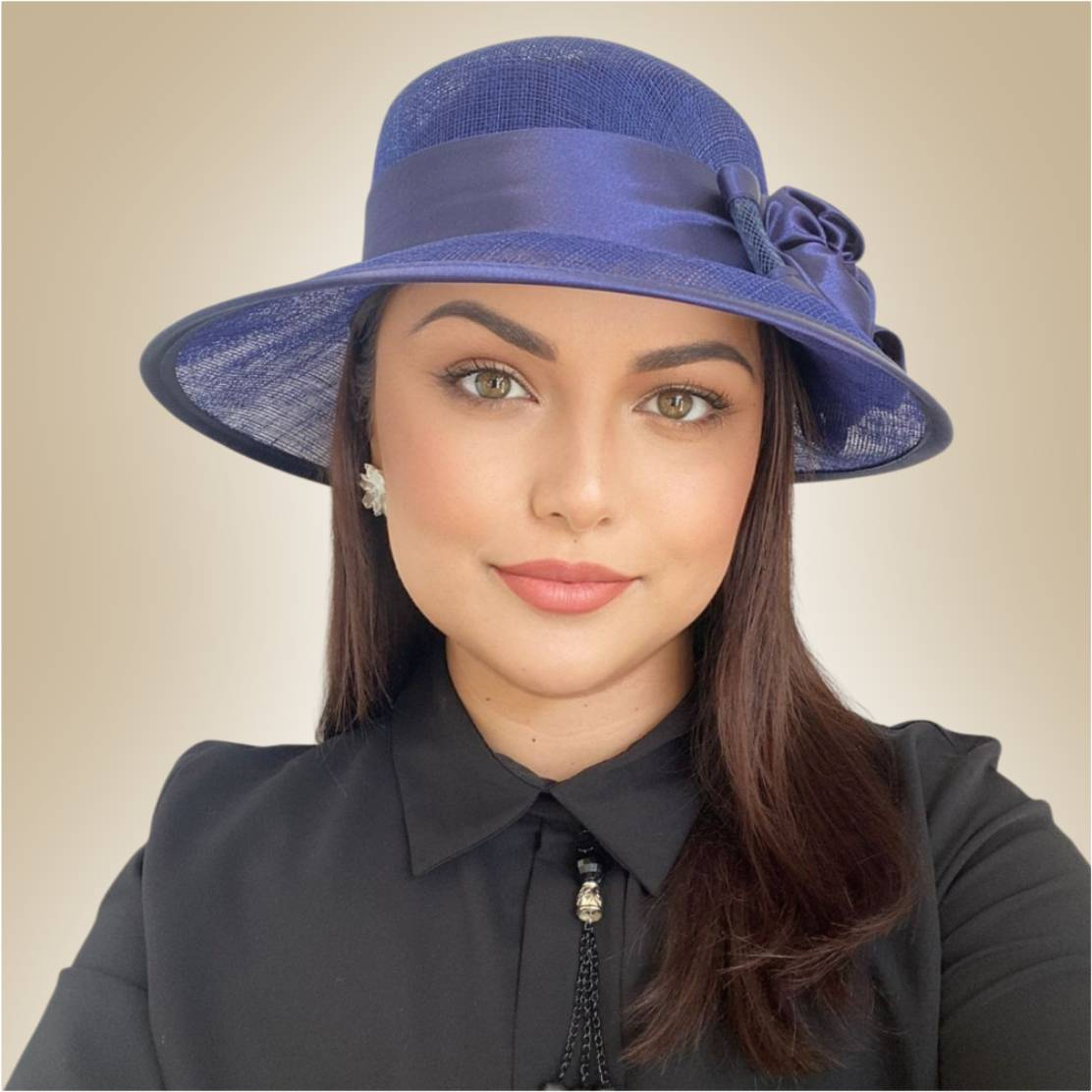 • Accesorizare: palarie de dama cu decor luxuriant cu panglica din satin de jur imprejur si 2 trandafiri stilizati din satin, asezati lateral