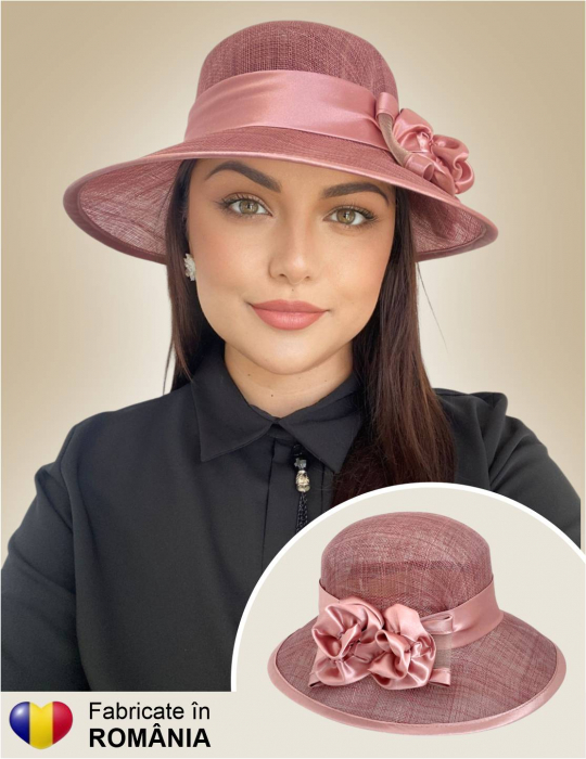 • Accesorizare: palarie de dama cu decor luxuriant cu panglica din satin de jur imprejur si 2 trandafiri stilizati din satin, asezati lateral