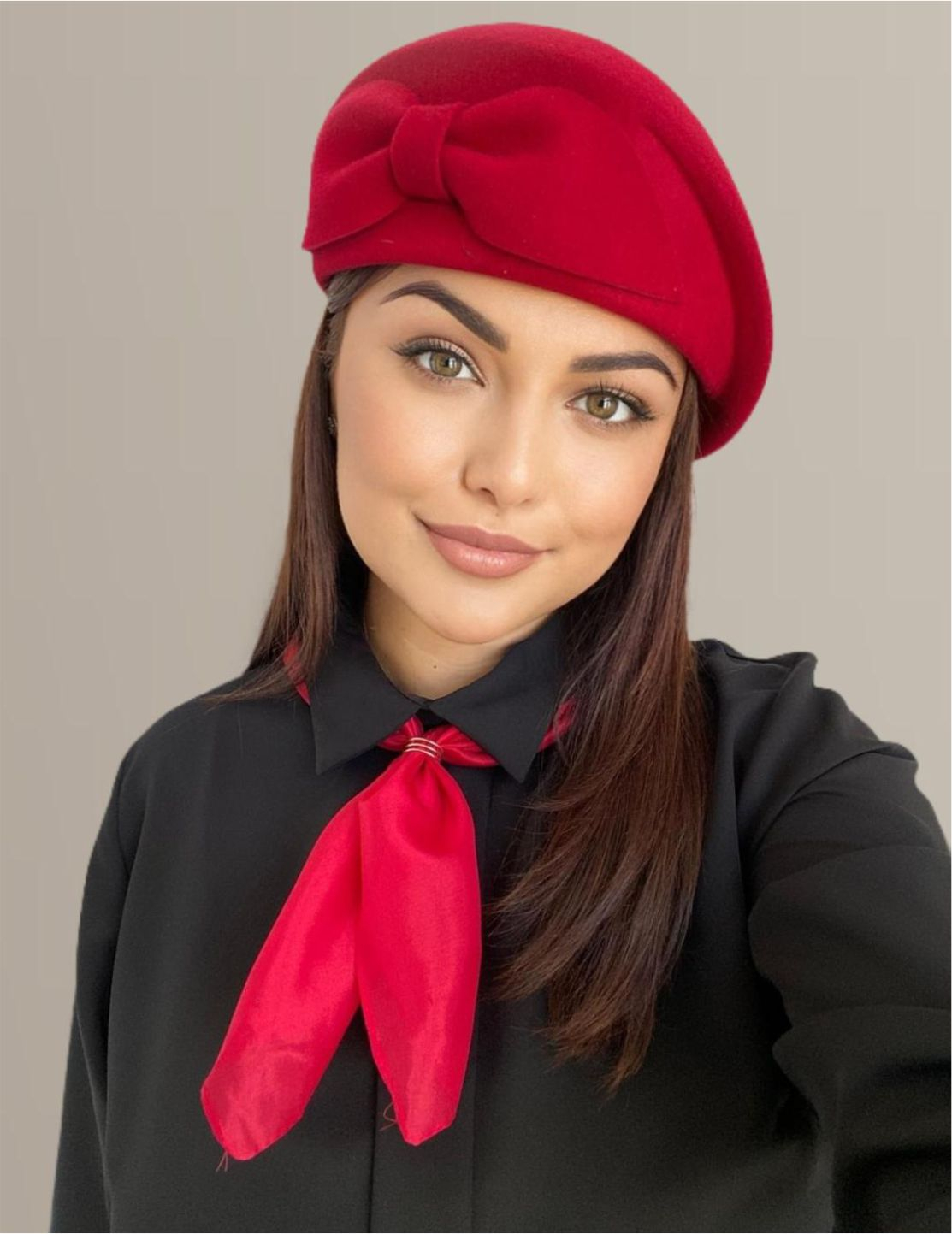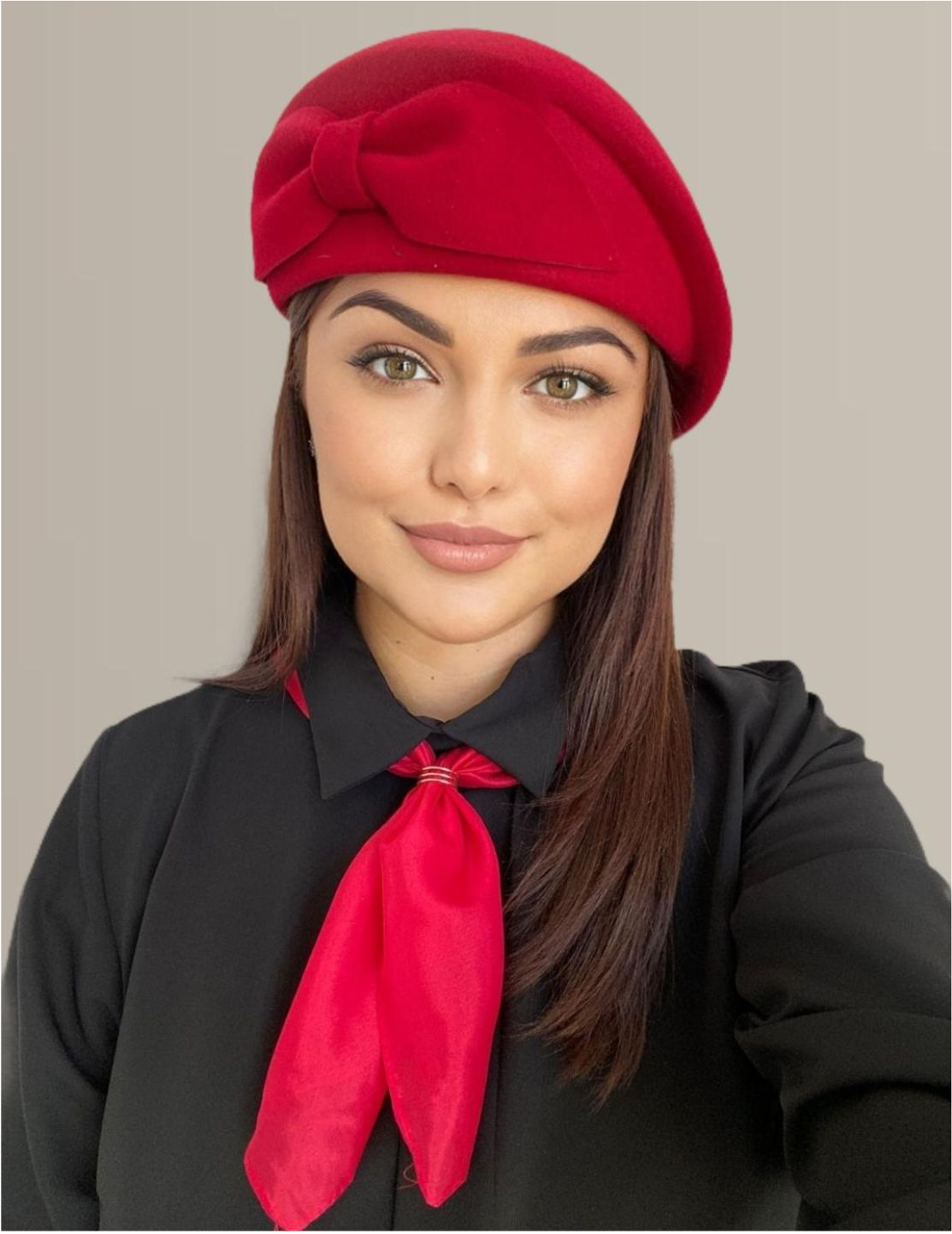 Palarie lux dama toca pe colt cu funda PRINCESS CHIC + esarfa CADOU (ROSU) - marime unica, reglabila